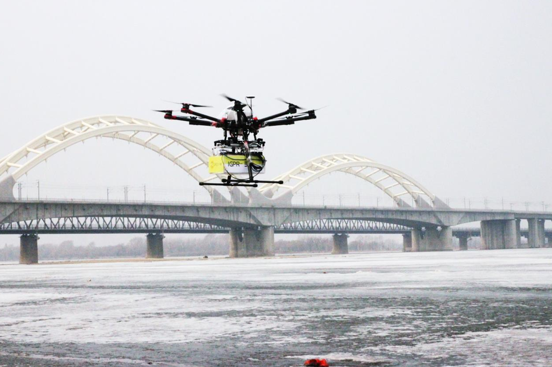大連中??萍及l(fā)展有限公司歷時一年研發(fā)的IGPR-30無人機飛航測冰雷達,2016年初在松花江哈爾濱江段試驗成功,獲得了清晰準(zhǔn)確的連續(xù)冰層雷達圖像。飛航測冰現(xiàn)場,系統(tǒng)飛行姿態(tài)穩(wěn)定,雷達探測成像清晰,操控靈敏,可以10-15m/s速度快速連續(xù)施測,可實時獲取高精度的河流冰層連續(xù)厚度數(shù)據(jù)。IGPR-30無人機飛航測冰雷達集成了RTK精確定位系統(tǒng),可準(zhǔn)確測量記錄飛航測線軌跡,并與GIS地圖融合。IGPR-30無人機飛航測冰雷達是河流冰情觀測的創(chuàng)新性技術(shù)設(shè)備,為河流冰情快速精準(zhǔn)測量和河流凌汛應(yīng)急探測提供了先進的高效率的技術(shù)手段。